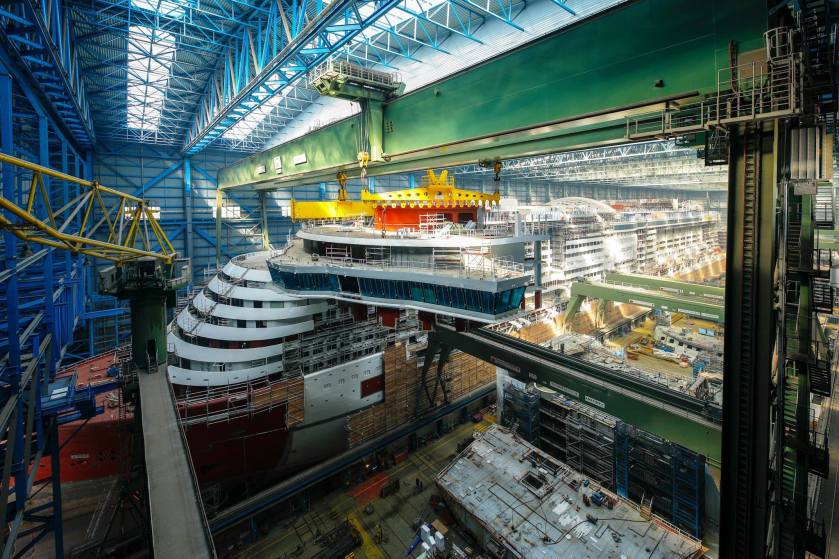 Gisteren is met de montage van de grootste brug van de AIDA vloot de staalbouw van de AIDAnova op de Duitse scheepswerf Meyer Werf afgesloten. De Brug is het 90e bouwblock wat sinds september 2017 het schip vormt. Om 11 uur werd het 345 tonnen met de grootste kraan van bouwhal 2 in positie gebracht. Het 500 vierkantenmeter en 50 meter lange brugdeel is de grootste van de AIDAvloot. Dankij 30 km kabel zal de modernste stuurtechniek het schip door de zee kunnen manoeuvreren. Door de beperkte hoogte 69 meter van de bouwhal pas na het uitdoken nog de Mast en de schoorsteen op hun plaats worden gezet.