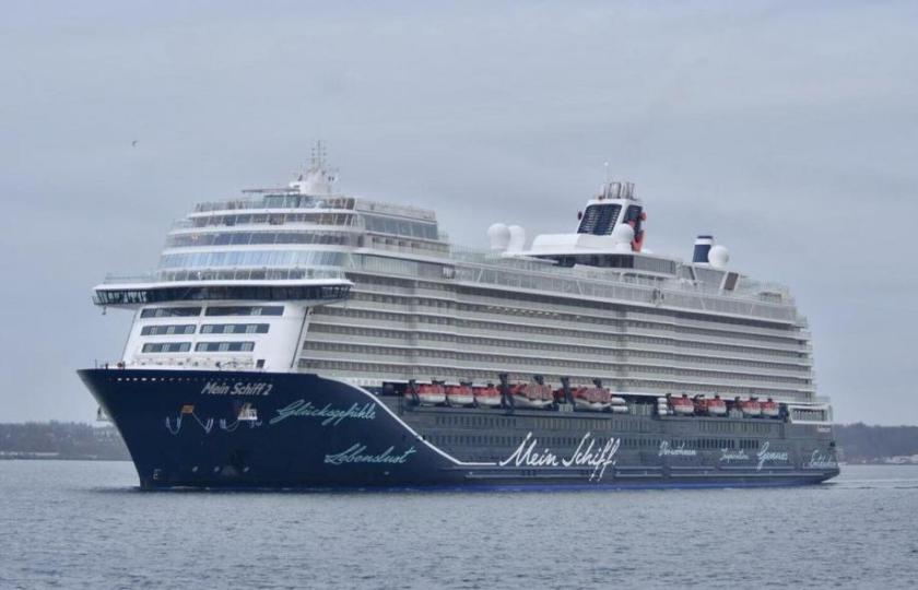 De nieuwe Mein Schiff 2 sinds zaterdag al in Kiel aangekomen. Het schip is nog niet aan Tui Cruises overgedragen, omdat het schip nog onder Finse vlag vaart.