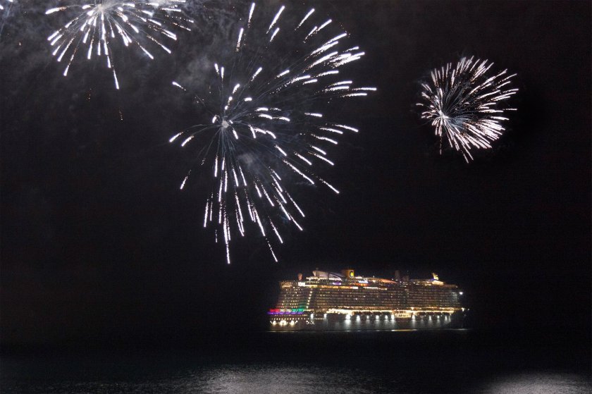 Cruz voerde de lintsnijwerkzaamheden uit met het traditionele breken van de fles tegen de boeg van het schip in aanwezigheid van de Meester van Costa Smeralda, Paolo Benini.