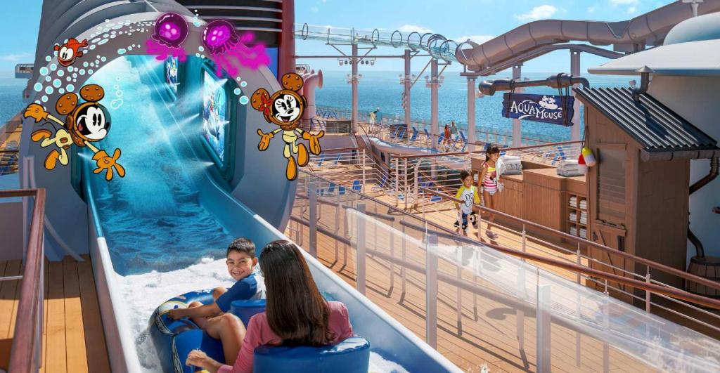 Een andere nieuwe feature aan dek zal de AquaMouse zijn – een waterrit van 760 voet met showscènes, verlichting en speciale effecten, en volgens Disney spetterende verrassingen. Daarnaast komen er meer zwembaden en dekruimte, evenals een waterspeeltuin voor kinderen en gezinnen.