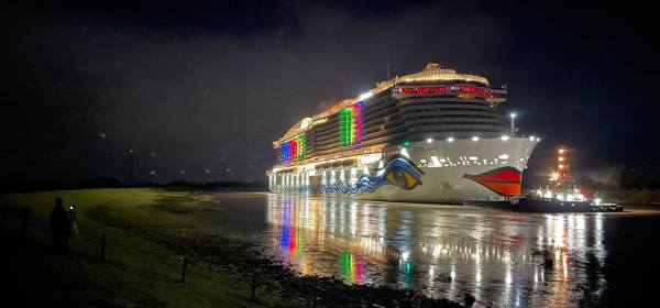 De AIDAcosma heeft de Eemsovertocht voltooid. AIDA Cruises zei dat twee sleepboten het schip achterwaarts door de doksluis van Meyer Werft hebben getrokken. Het schip