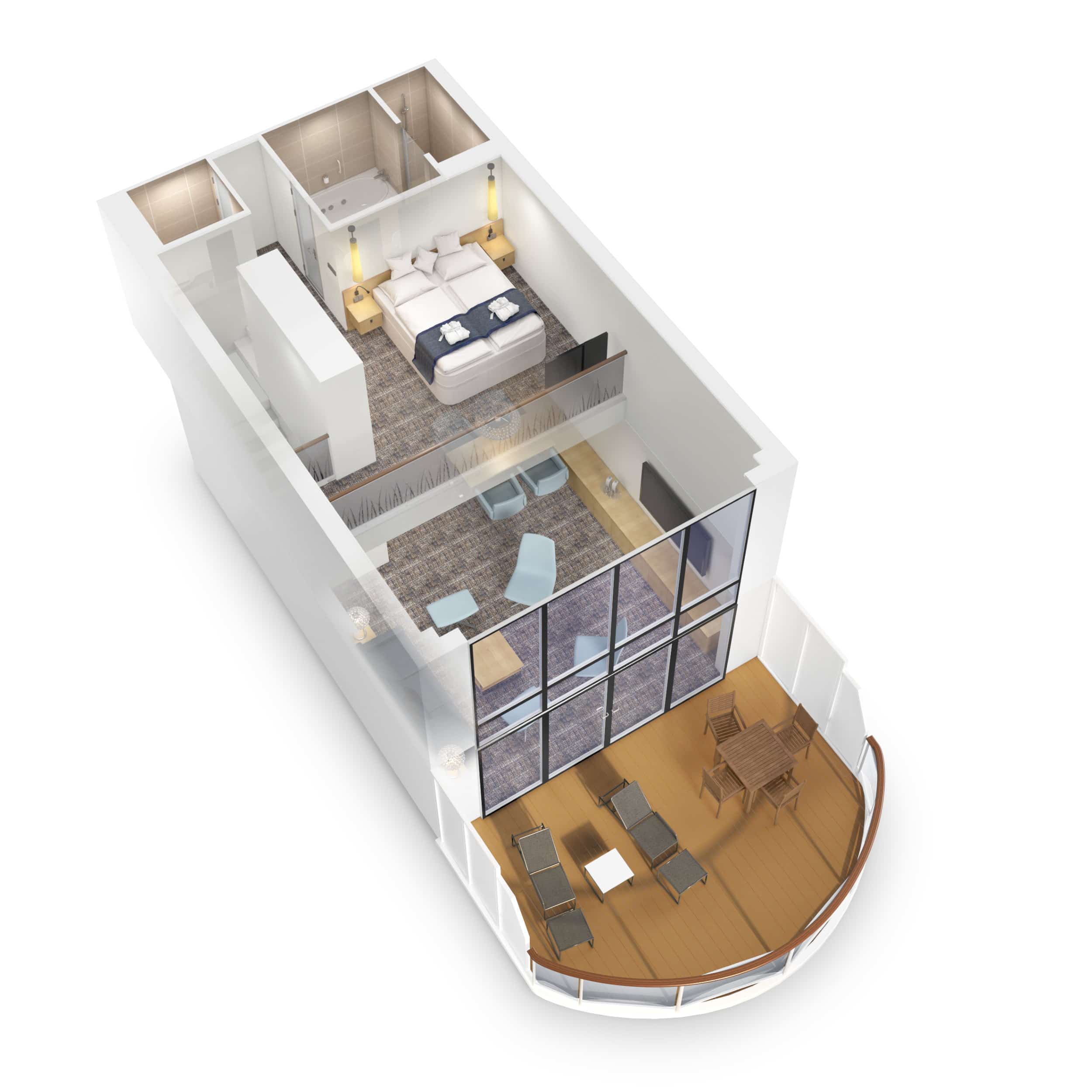 De Duplex Suites op dek 9/10 en 12/13 bezitten op de begane grond over een ronde zitbank, een sofabed en een bureau. Buiten op het balkon staat een privé bubbelbad en twee ligbedden. Op de bovenverdieping staat het vaste tweepersoonsbed met tv, inloopkast en badkamer met bad. Ook op de benedenverdieping is er een badkamer en inloopkast.