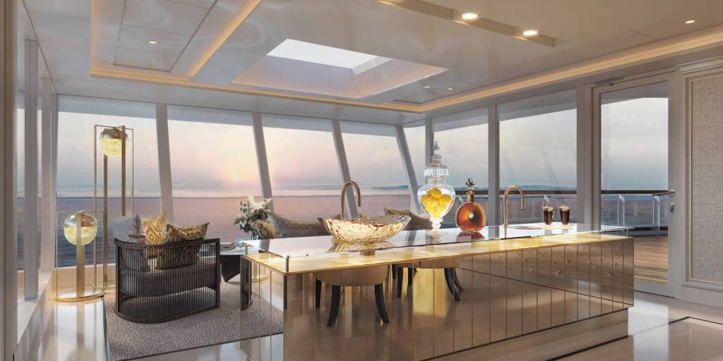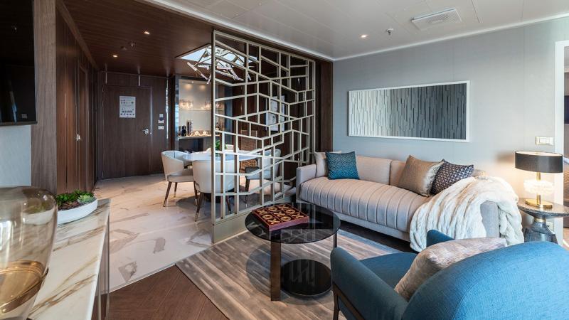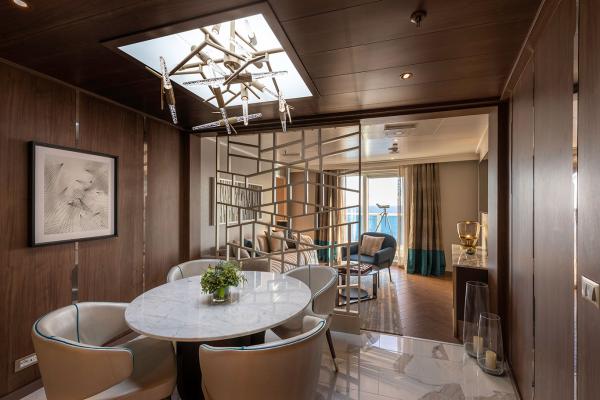 De nieuwe luxueuze suite van 413m² is te vinden op het 14e dek boven de brug van Seven Seas Splendor.