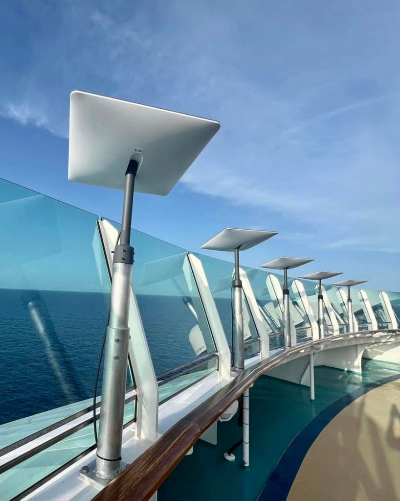 Volgens foto’s van de opstelling die zijn gedeeld door Facundo Giacobbe, een lid van de Singapore Cruise Society, zijn er minstens 11 Dishy McFlatface’s geïnstalleerd op paalbevestigingen aan de boeg van het schip.