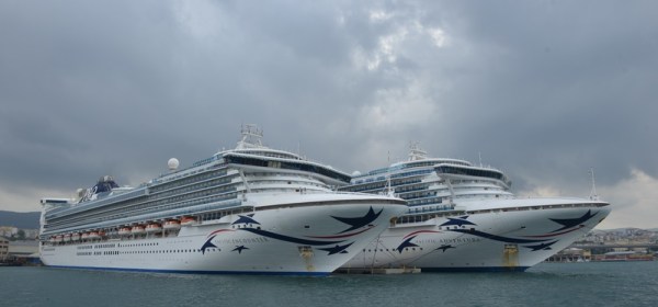 P&O Cruises Australia’s Pacific Encounter vaart naar huis naar Australië na een nachtelijke ontmoeting met zusterschip de Pacific Adventure terwijl het zij aan zij in