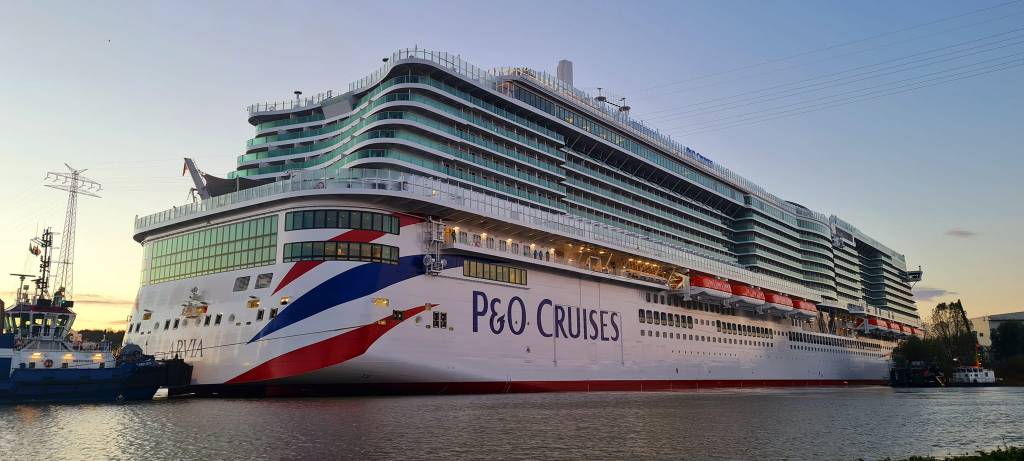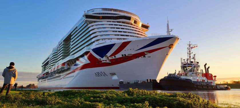 Het nieuwste schip van P&O Cruises, de Arvia, is op weg vanuit Meyer Werft in Papenburg, over de Ems naar Eemshaven, Nederland.
