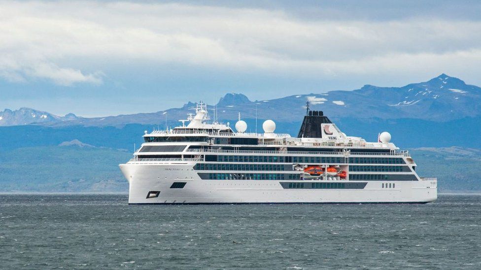 Het schip ligt aangemeerd in Ushuaia terwijl passagiers wachten op verdere reisplannen van Viking, volgens Gooding, die zei dat twee andere schepen in hun baai in Ushuaia ook beschadigd waren, mogelijk door malafide golven.