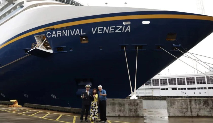 President van Carnival Cruise Line Christine Duffy begroette gasten met een speciaal evenement om hen welkom te heten aan boord van de Carnival Venezia. Ze werd vergezeld door kapitein Claudio Cupisti en enkele van de eerste gasten van het schip bij het doorknippen van een ceremonieel lint.