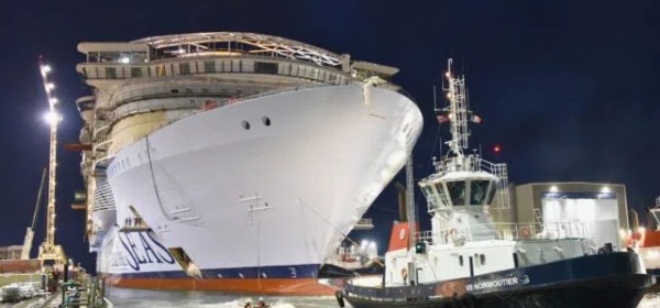 Het straks grootste cruiseschip ter wereld werd gisteren uitgedokt bij de werf in Saint Nazaire. De Utopia of the seas heeft de volgende bouwfase bereikt