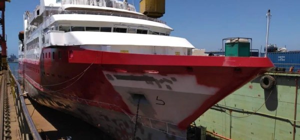 De Exploris One krijgt vorm op een scheepswerf in Chili, voorafgaand aan de eerste cruise van het bedrijf naar Antarctica later deze maand, terwijl de