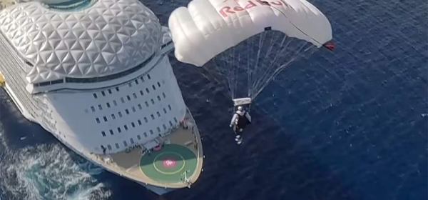 De Utopia of the Seas organiseerde ’s werelds eerste skydive-evenement op een cruiseschip toen Red Bull Airforce-skydivers Luke Aikins en Miles Daisher landden op de