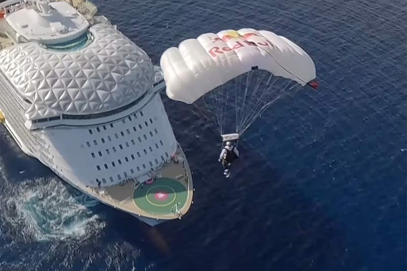 De Utopia of the Seas organiseerde ’s werelds eerste skydive-evenement op een cruiseschip toen Red Bull Airforce-skydivers Luke Aikins en Miles Daisher landden op de boeg van het nieuwe Royal Caribbean-schip.