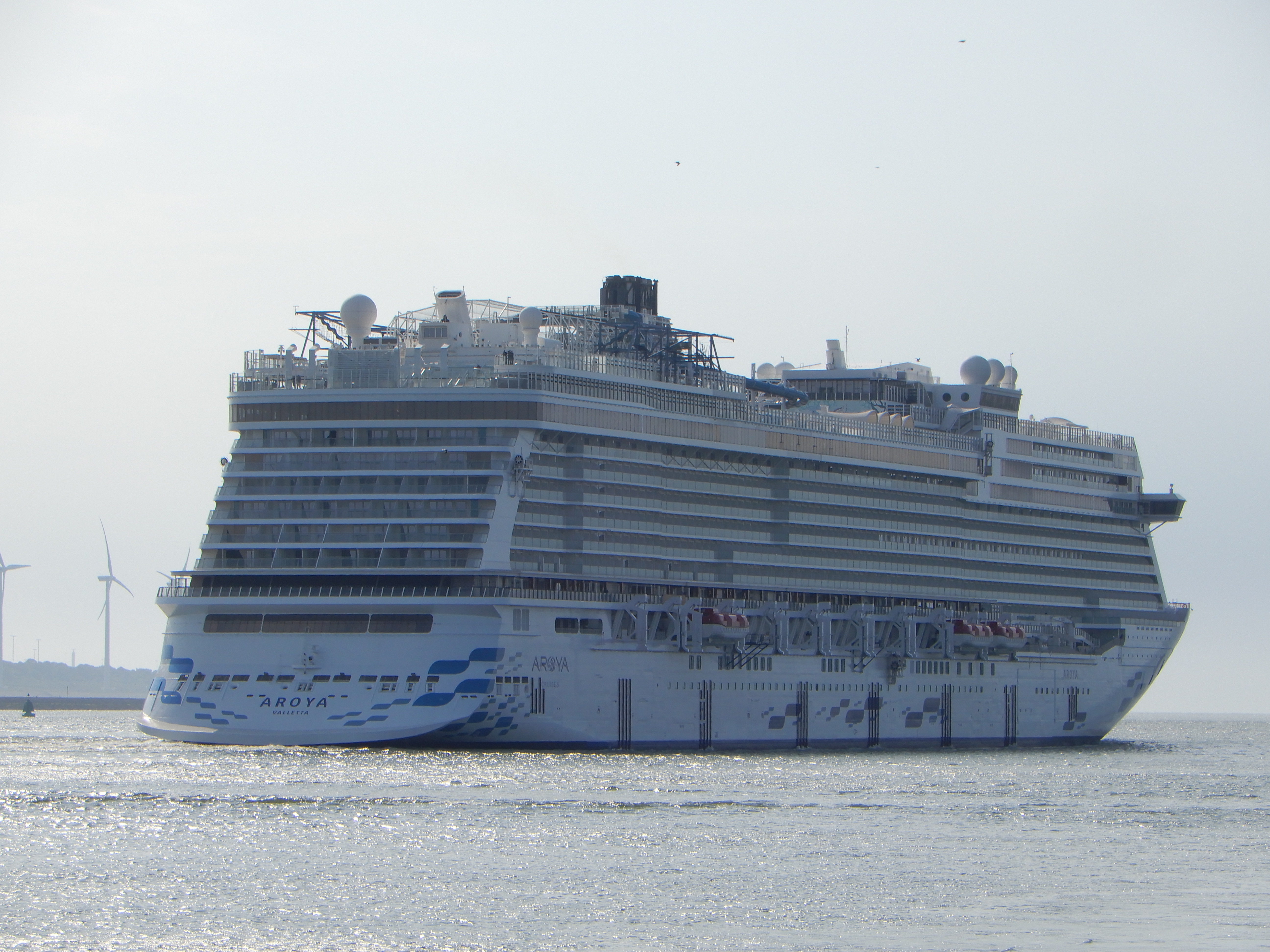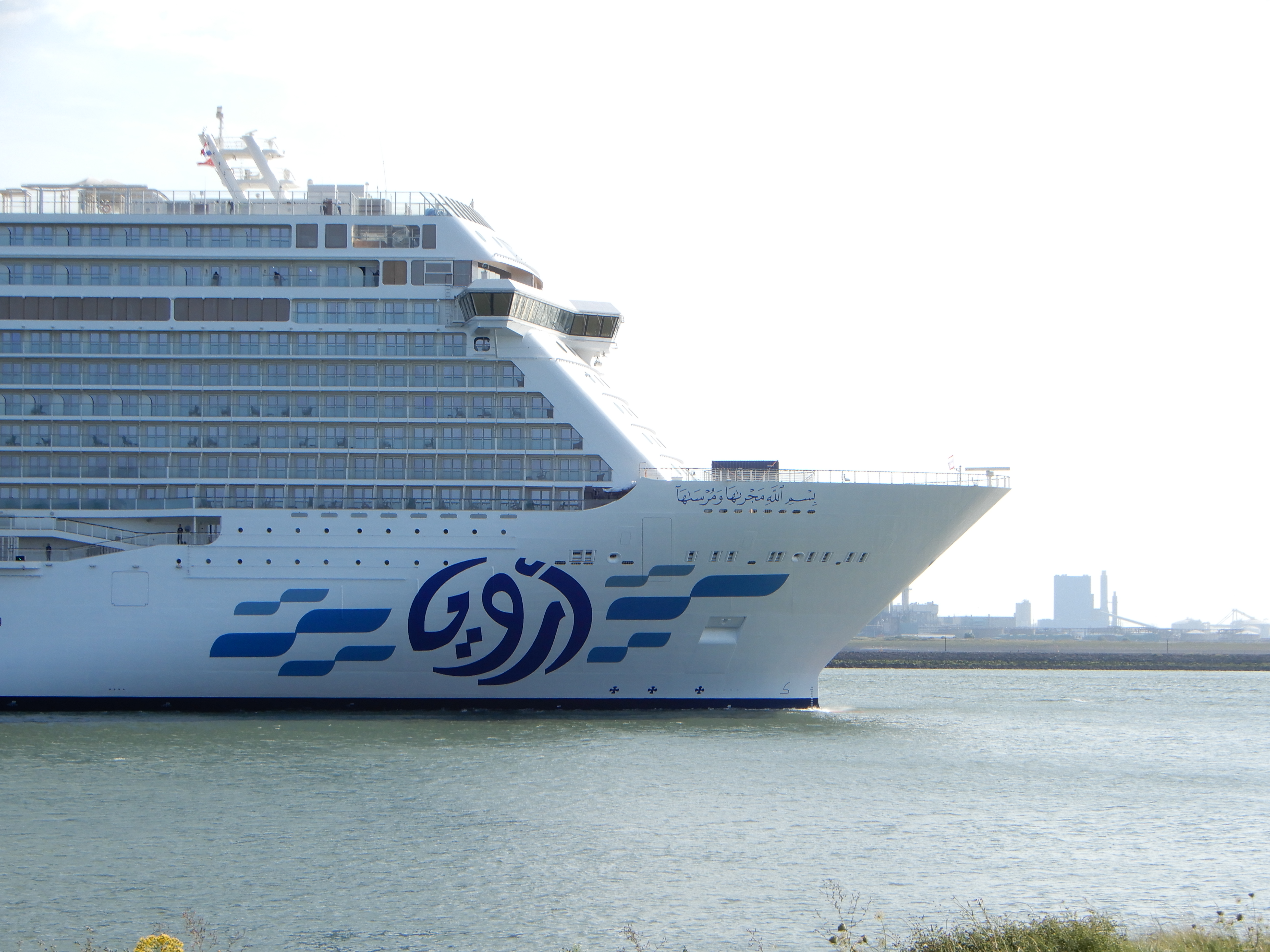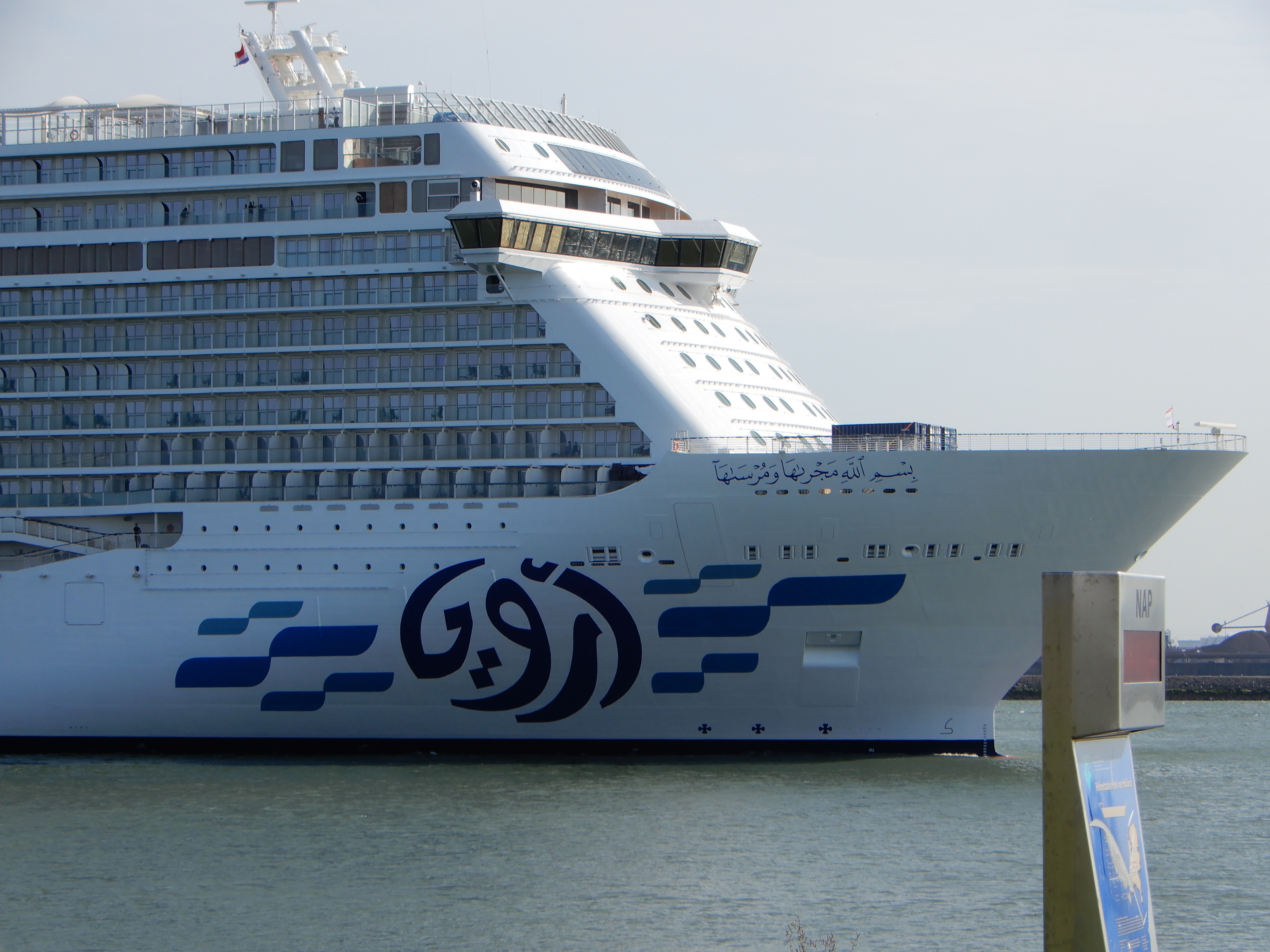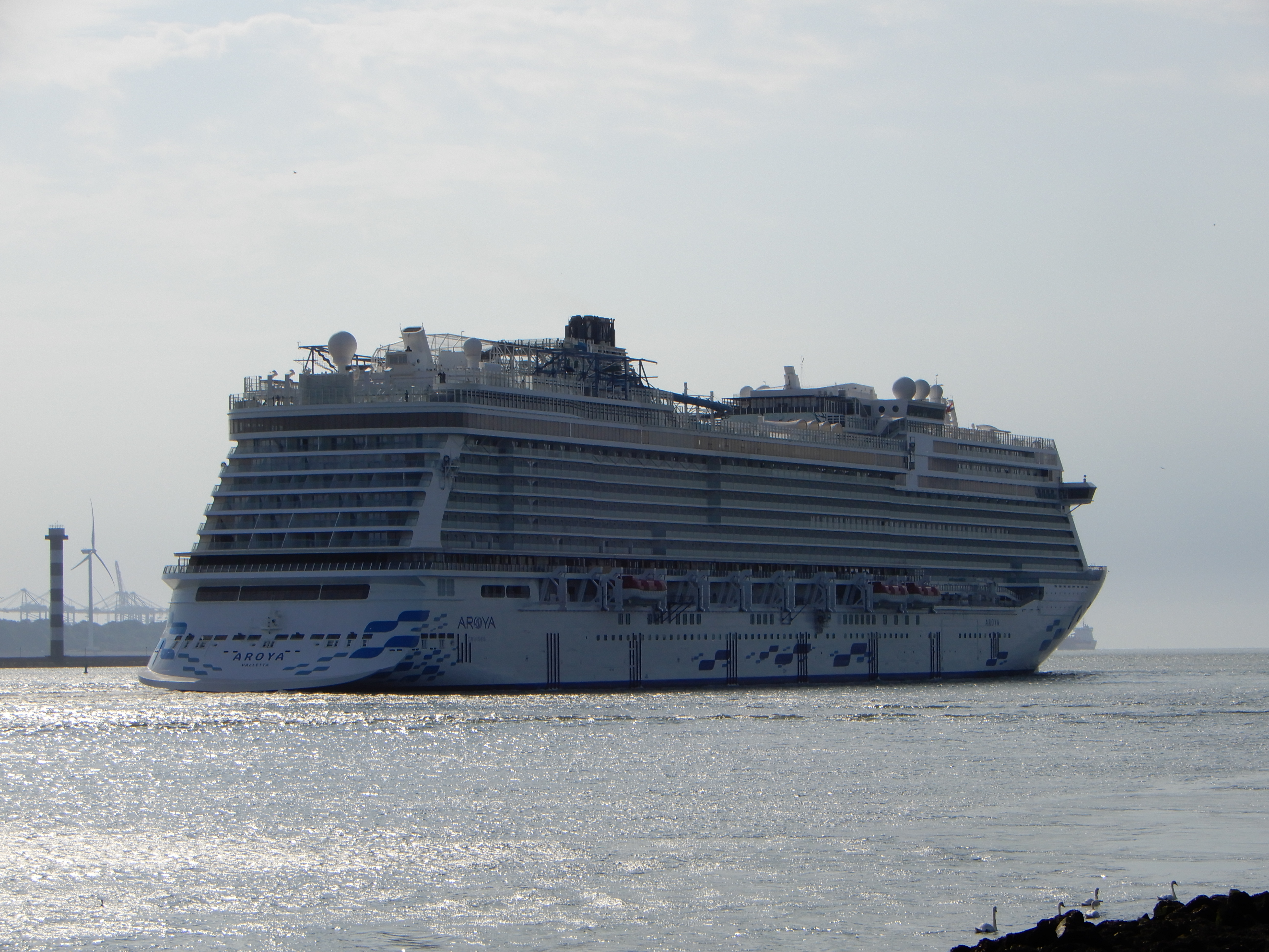 De Aroya heeft vandaag de schepswerf Damen Verolme in Rotterdam verlaten. Na twee maanden in het droogdok heeft het schip nieuwe livery gekregen voor de nieuwe rederij Aroya cruises. Het schip is nu op weg naar Bremerhaven waar het een jaar geleden, nog met de naam Manara aankwam, waar het lang aan de kade heeft gelegen. De voornamelijke Manara, die daarvoor dan weer World dream heeft gehad zal in Bremerhaven nog de laatste afwerking krijgen. er staan nog containers op de boeg, de D fenders zijn nog beschermt en het meest opvallende is dat de schoorsteen nog steeds logoloos is.