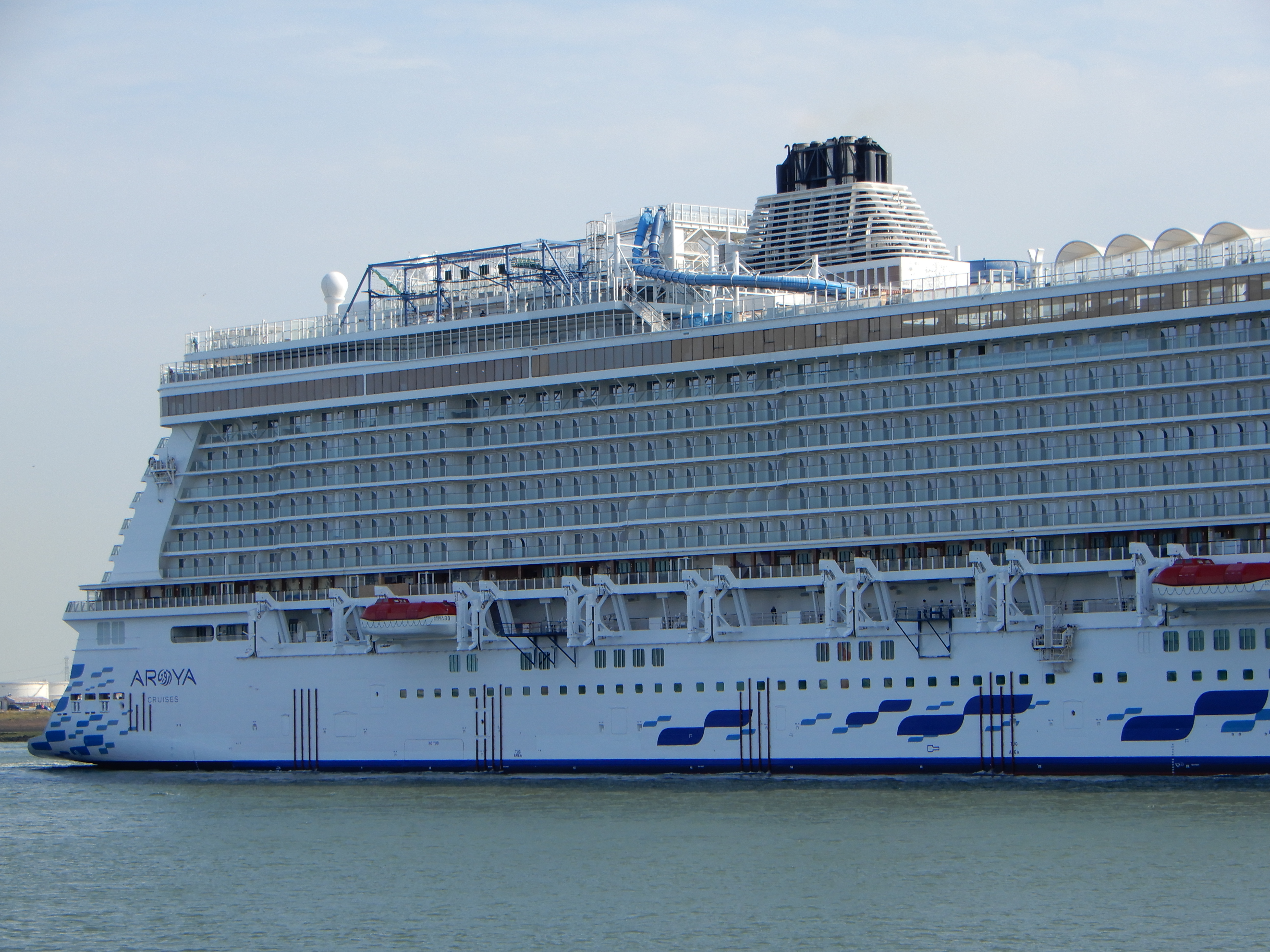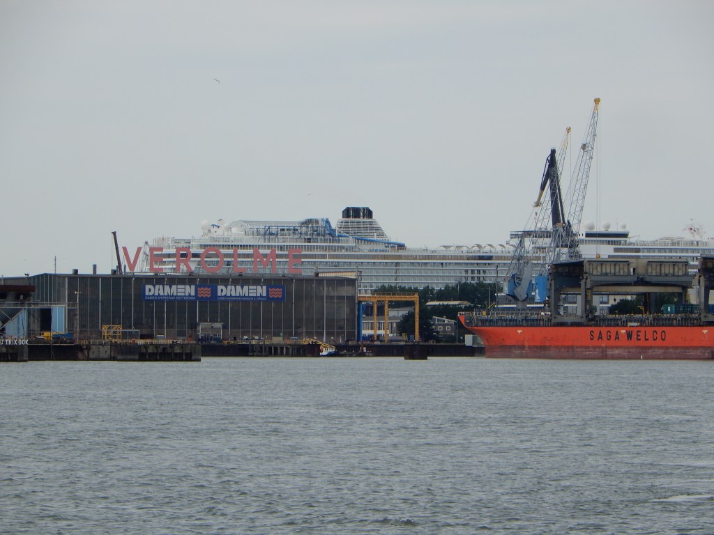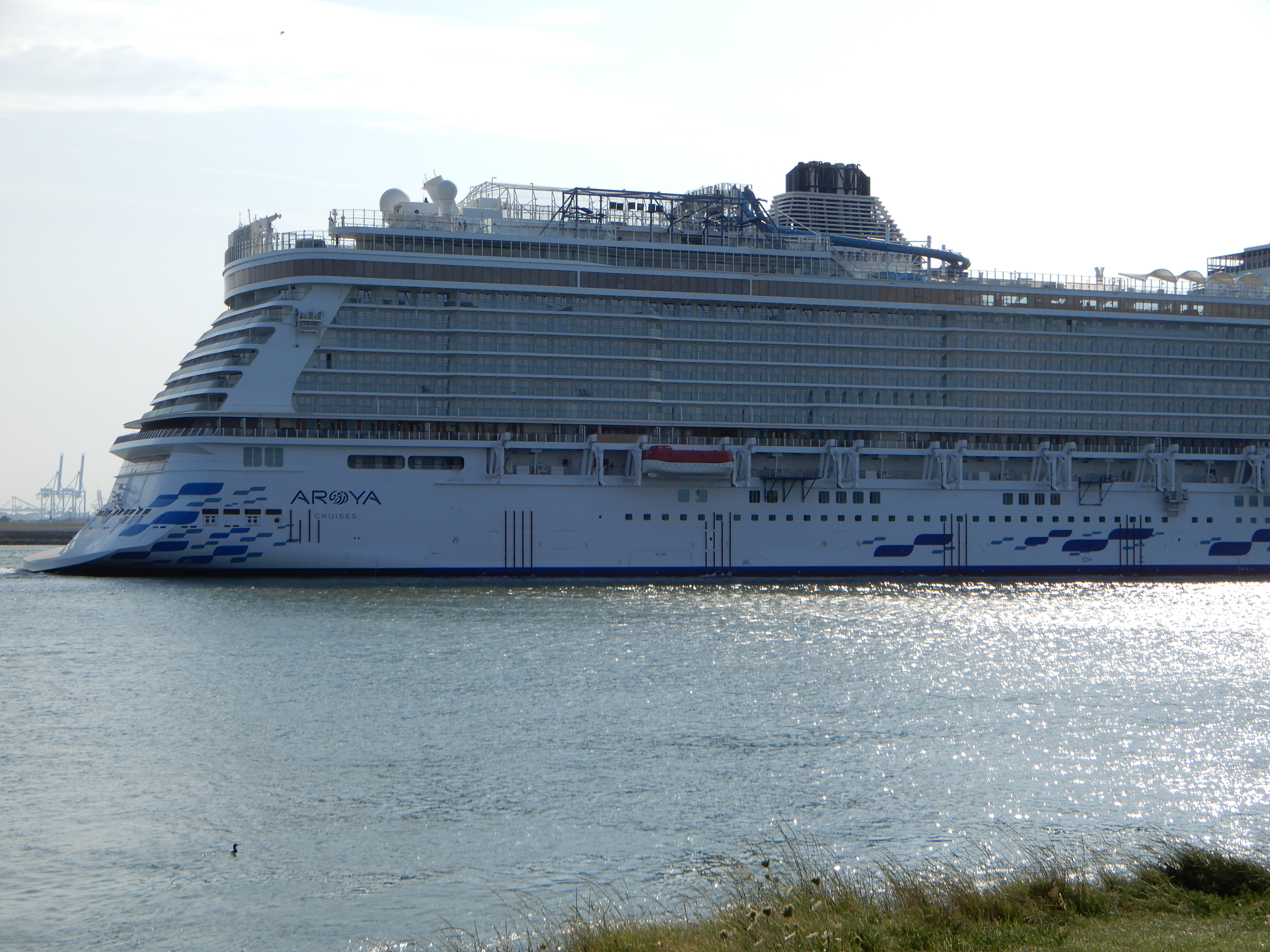 De Aroya heeft vandaag de schepswerf Damen Verolme in Rotterdam verlaten. Na twee maanden in het droogdok heeft het schip nieuwe livery gekregen voor de nieuwe rederij Aroya cruises. Het schip is nu op weg naar Bremerhaven waar het een jaar geleden, nog met de naam Manara aankwam, waar het lang aan de kade heeft gelegen. De voornamelijke Manara, die daarvoor dan weer World dream heeft gehad zal in Bremerhaven nog de laatste afwerking krijgen. er staan nog containers op de boeg, de D fenders zijn nog beschermt en het meest opvallende is dat de schoorsteen nog steeds logoloos is.