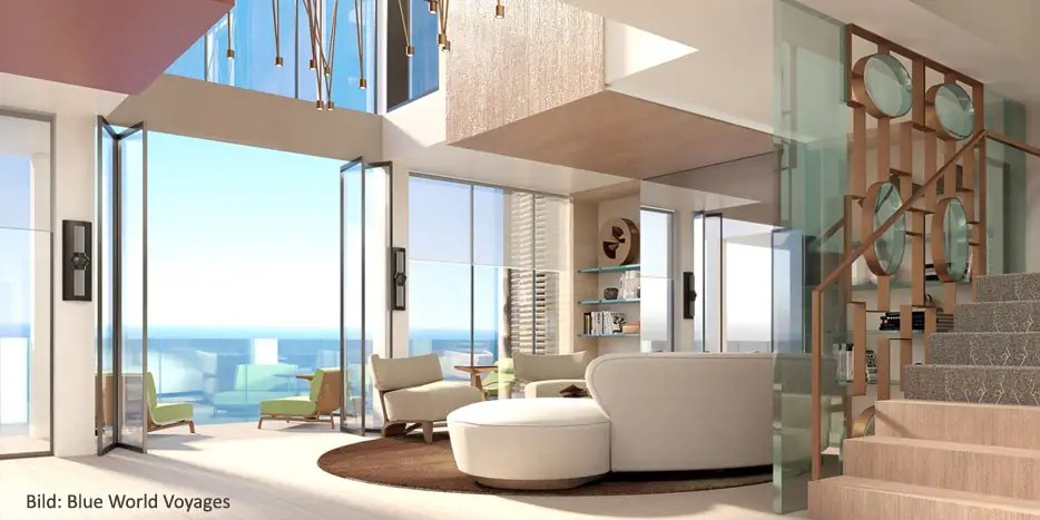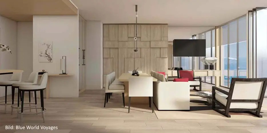 Op het cruiseschip Blue Ocean Voyages komen 160 suites met een woonoppervlak van 32,7 vierkante meter, die net als reguliere cruises kunnen worden geboekt. Volgens de website komen er ook suites voor individuele reizigers.
