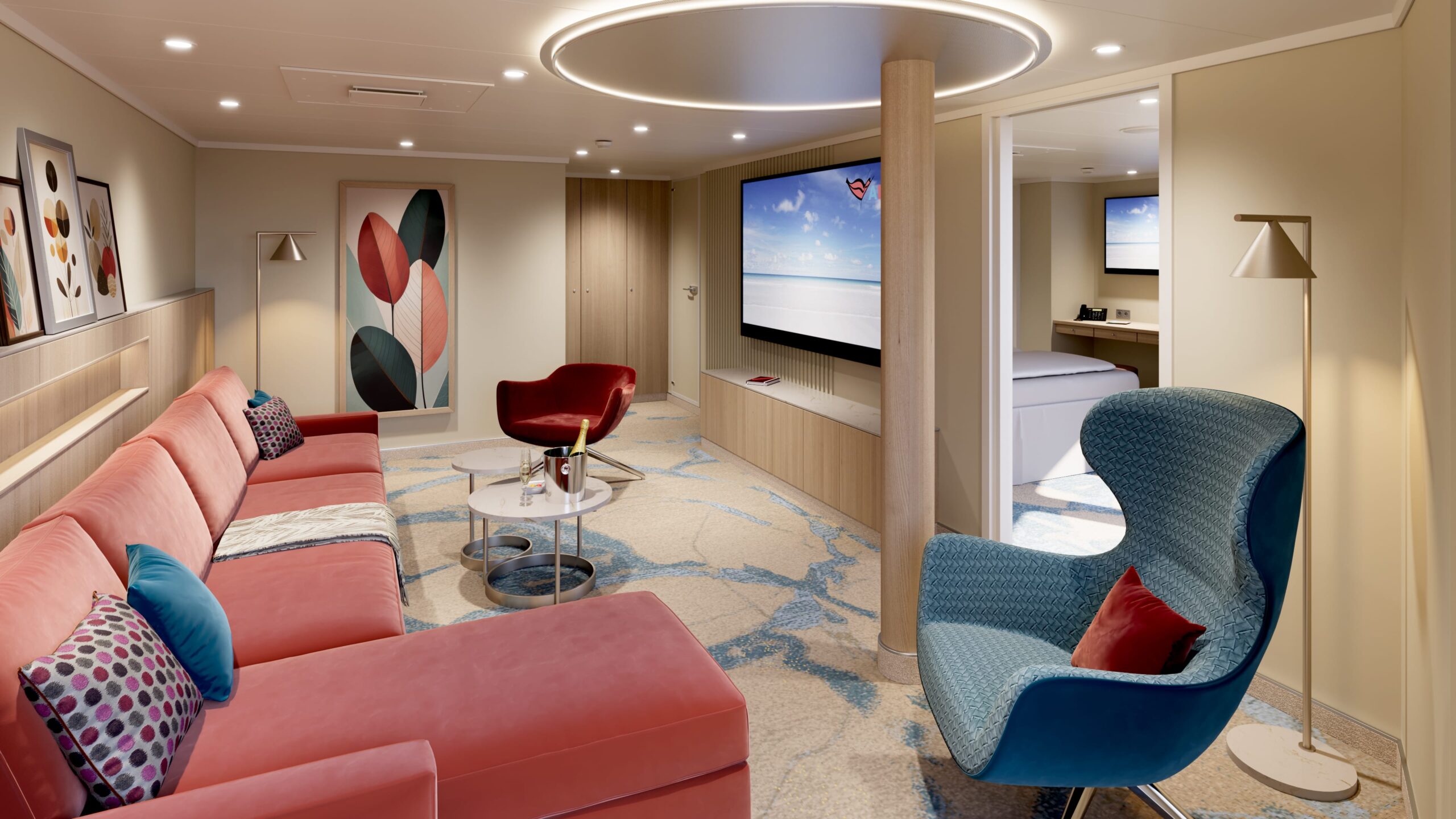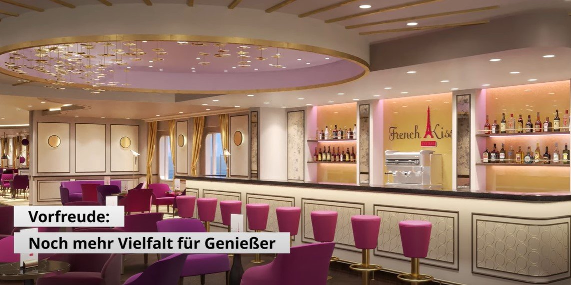 Het AIDAdiva-theater met veel omliggende bars krijgt een nieuw ontwerp. AIDA Cruises belooft nieuwe, uitnodigende zitplekken en een nog meer feel-good sfeer. Toen de AIDA Evolution werd aangekondigd, werd een foto gepubliceerd van een gerenoveerde bar, wat Cafe Mare in het Theatrium op dek 10 lijkt te zijn.