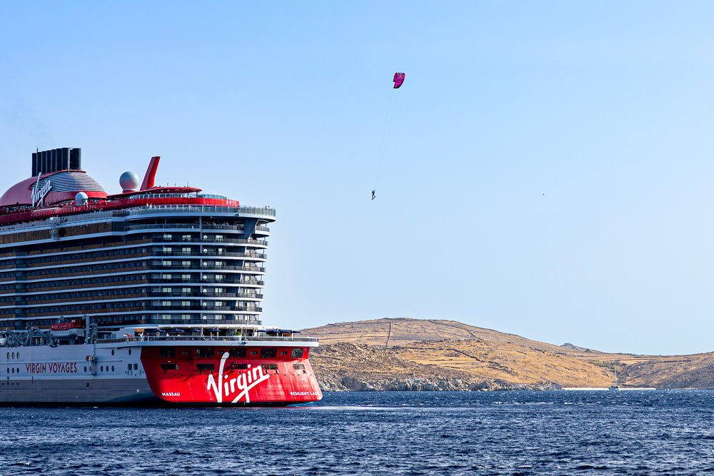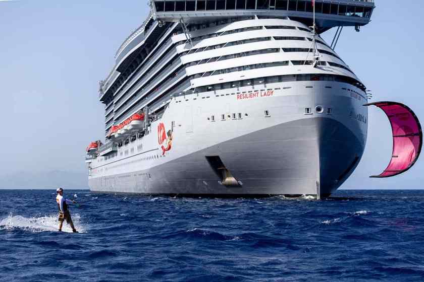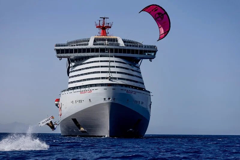 Britse kitesurfer en Red Bull-atleet Tom Bridge transformeerde de Resilient Lady van Virgin Voyages in een kitesurflocatie vanaf dek 16, ongeveer 129 voet hoog.