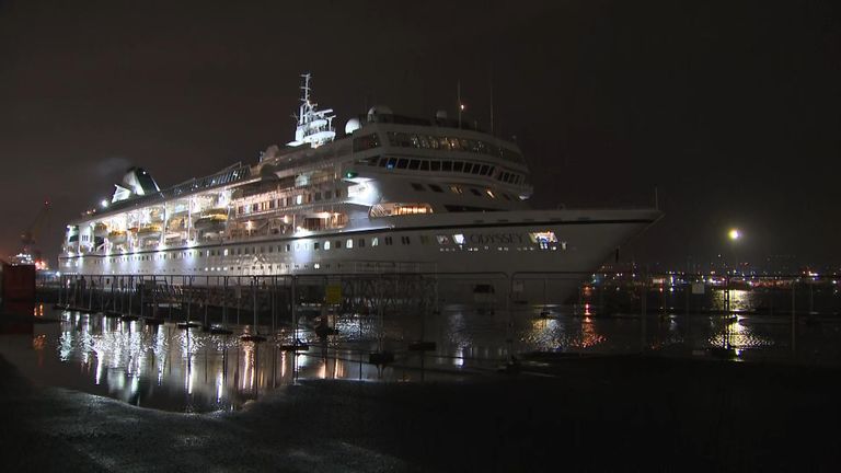 De Odyssey van Villa Vie Residences zou de stad in mei verlaten, maar vijf maanden na aankomst moet het schip de wateren van Noord-Ierland nog verlaten vanwege vertragingen.
