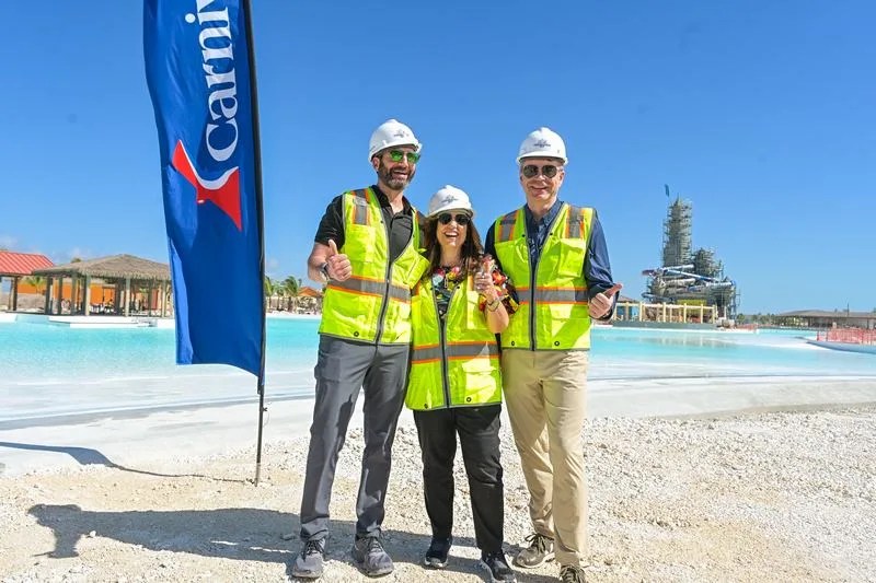 Josh Weinstein, Chief Executive Officer van Carnival Corporation, en Lars Ljoen, Chief Maritime Officer, namen samen met Christine Duffy, President van Carnival Cruise Line, een kijkje achter de schermen bij Celebration Key op Grand Bahama.