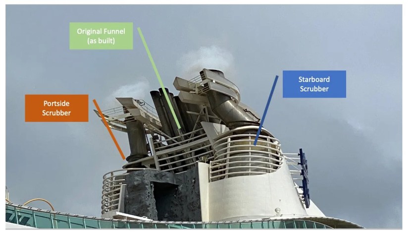 Bij de Freedom klasse is dat heel duidelijk te zien aan de schoorsteen. Al tijdens het varen werd eerst de installatie in loop van weken geïnstalleerd en toen de schoorsteen eromheen gebouwd. Bij de meeste cruiseschepen zijn ze goed weg gewerkt. En bij nieuwe cruiseschepen waren ze uiteraard als ingebouwd.