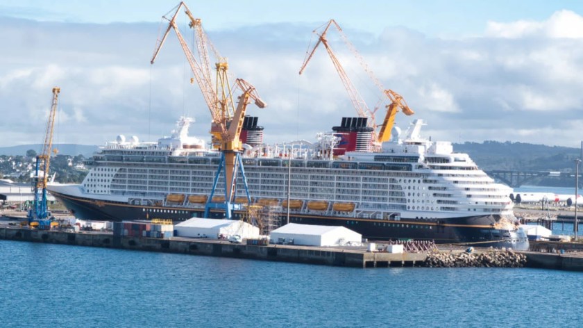 De Disney Fantasy krijgt een nieuwe bolvormige boeg tijdens haar verblijf op de Damen Shiprepair-werf in Brest, Frankrijk.