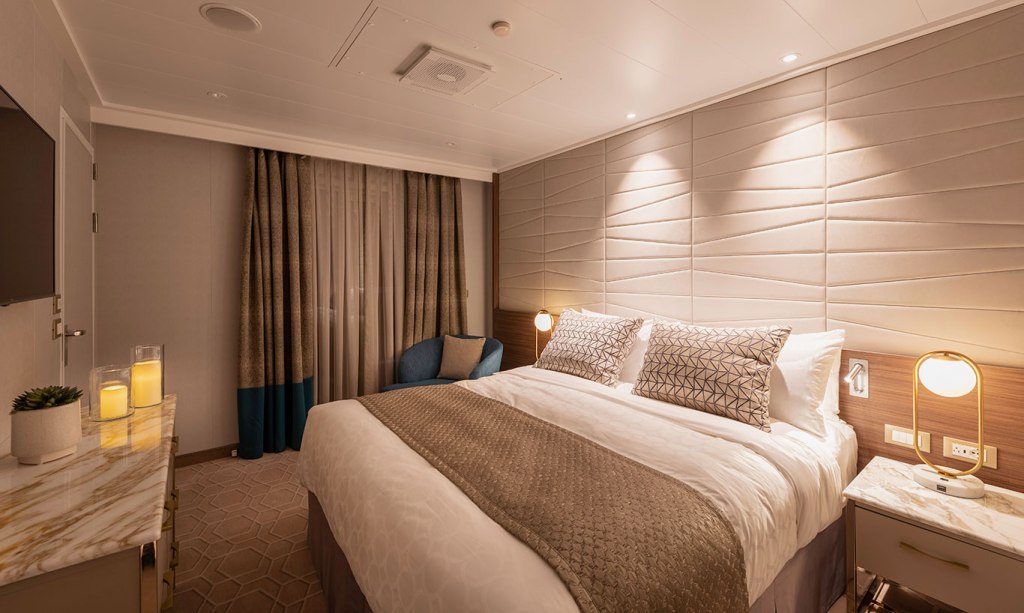 Dit privé buitenverblijf heeft een normale breedte op het voorste gedeelte dat uitkijkt op het zwembaddek, maar maakt dan een bocht rond de stuurboordzijde.