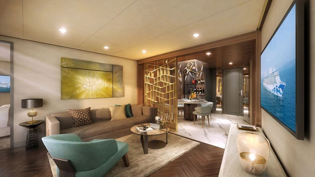 Aan weerszijden van het woongedeelte bevinden zich twee slaapkamers, beide met sfeervolle inrichting, grote flatscreen-tv’s en een Princess Luxury Bed. Nu op schepen in de hele vloot, is dit beddengoed ontwikkeld in samenwerking met board-gecertificeerde slaapexpert Dr. Michael Breus.