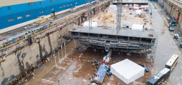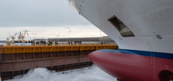 Vandaag is in Rostock op de MV werf de eerste sectie van de kiel van het eerste Global klasse schip in het droogdok gehesen. Het