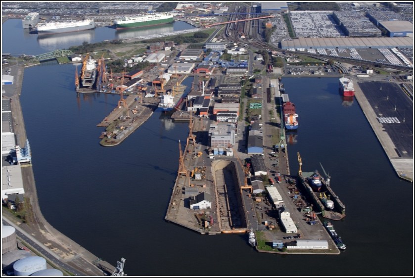 2015, piekactiviteit op de Lloyd scheepswerf, links de installatieschepen Aeolus (Van Oord) en Bold Tern (Olsen Windcarrier); Middenaanzicht van de Kaiserdok I met aangemeerde Akerdijk, helemaal rechts het hefplatform Thor bij het laden 2007 Uitbreiding van de Stena Britannica en Stena Hollandica